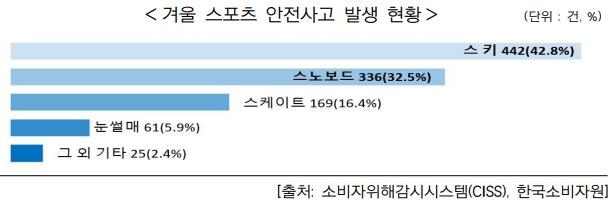 스키를 타다가 발생한 사고가 42.8%(442건)로 가장 많았다. 스노보드 32.5%(336건), 스케이트 16.4%(169건)가 그 뒤를 이었고, 눈썰매 사고도 5.9%(61건) 발생했다.