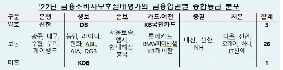 '양호' 등급 회사 수는 전년과 같은 3개사(신한은행, DB생명보험, KB국민카드)였다.