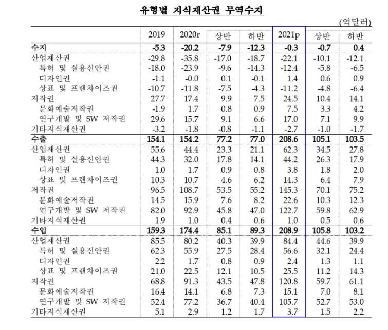 저작권 가운데 음악·영상을 포함한 문화예술저작권이 7억5천만달러 흑자로 역대 최대 기록을 세웠고, 연구개발·소프트웨어(SW) 저작권도 17억달러 흑자를 냈다.