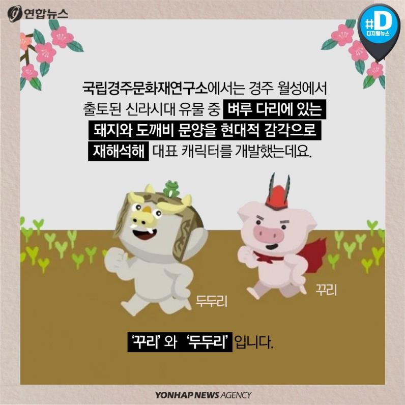국립경주문화재연구소에서는 경주 월성에서 출토된 신라 시대 유물 중 벼루 다리에 있는 돼지와 도깨비 문양을 현대적 감각으로 재해석해 대표 캐릭터를 개발했는데요.