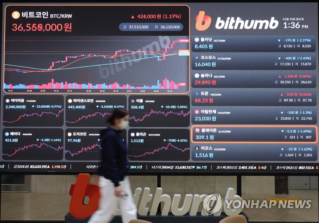 | ▲ This March 20, 2023, file photo shows a screen displaying the real-time price of cryptocurrencies at the headquarters of Bithumb, a South Korean crypto exchange, in southern Seoul. (Yonhap) |