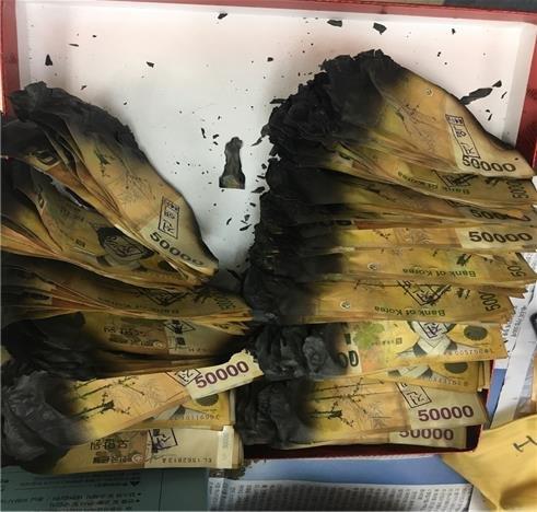 | ▲ This undated photo, released by the Bank of Korea on Jan. 16, 2019, shows burned 50,000-won banknotes. (Yonhap) |