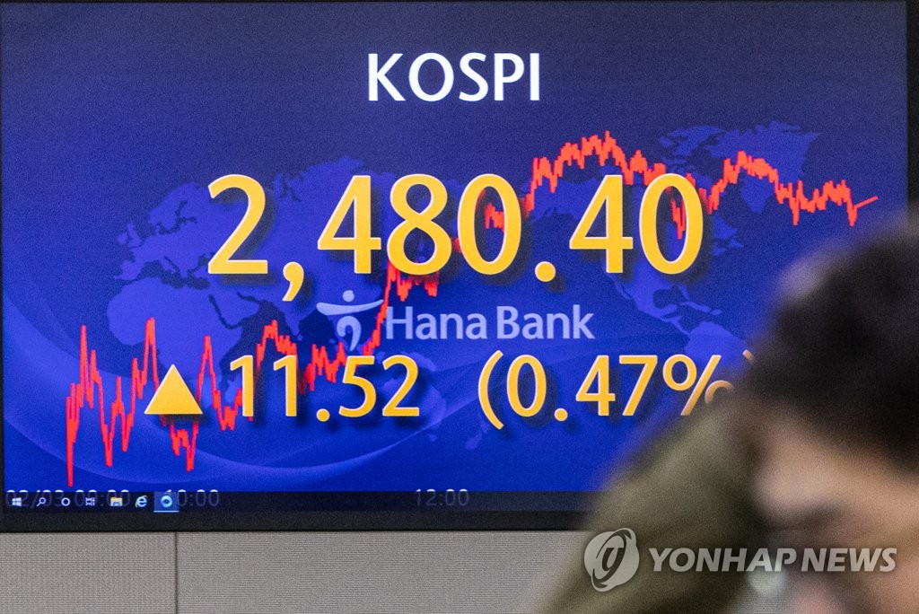 | ▲ An electronic signboard in the dealing room of Hana Bank in Seoul on Feb. 3, 2023, shows the benchmark Korea Composite Stock Price Index (KOSPI) having risen 11.52 points, or 0.47 percent, to close at 2,480.40. South Korean shares closed higher, as investors digested the U.S. Federal Reserve's latest rate decision earlier this week. (Yonhap) |