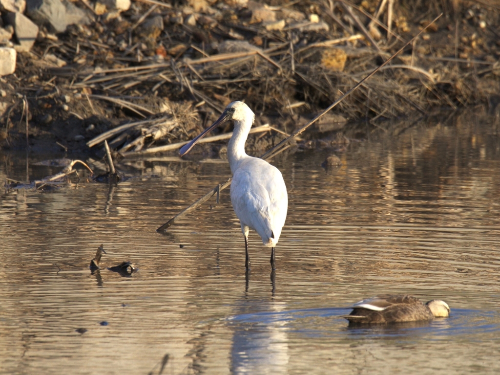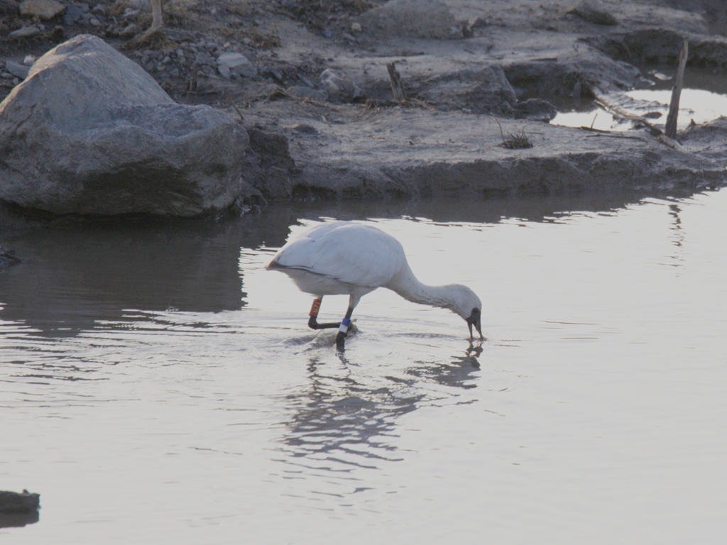 저어새는 주걱처럼 생긴 검은 부리로 물속을 휘휘 저어가며 먹이를 찾는다.