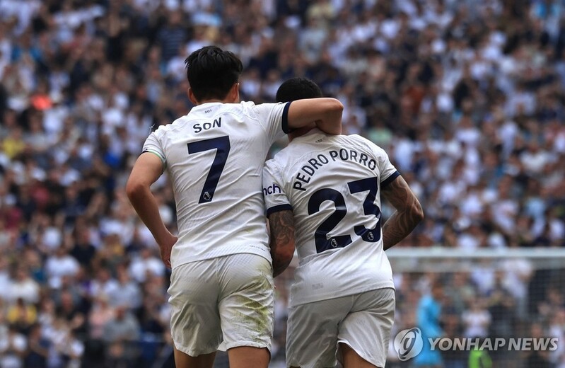 | ▲ 동점골을 터트린 페드로 포로와 어깨동무하는 손흥민(왼쪽) [EPA=연합뉴스] |