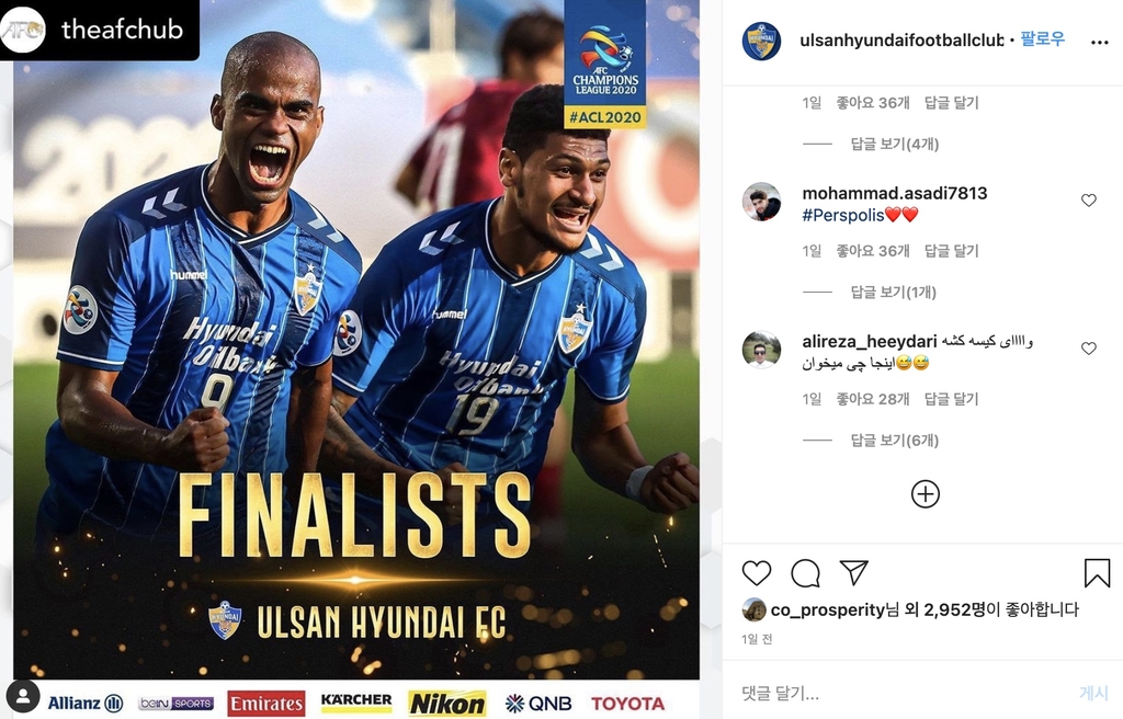 울산이 지난 13일 준결승에서 빗셀 고베(일본)를 꺾은 뒤 공식 인스타그램을 통해 결승 진출 소식을 알리자 울산 팬들은 물론 K리그 다른 팀 팬들까지 축하 댓글을 달며 우승을 기원했다.