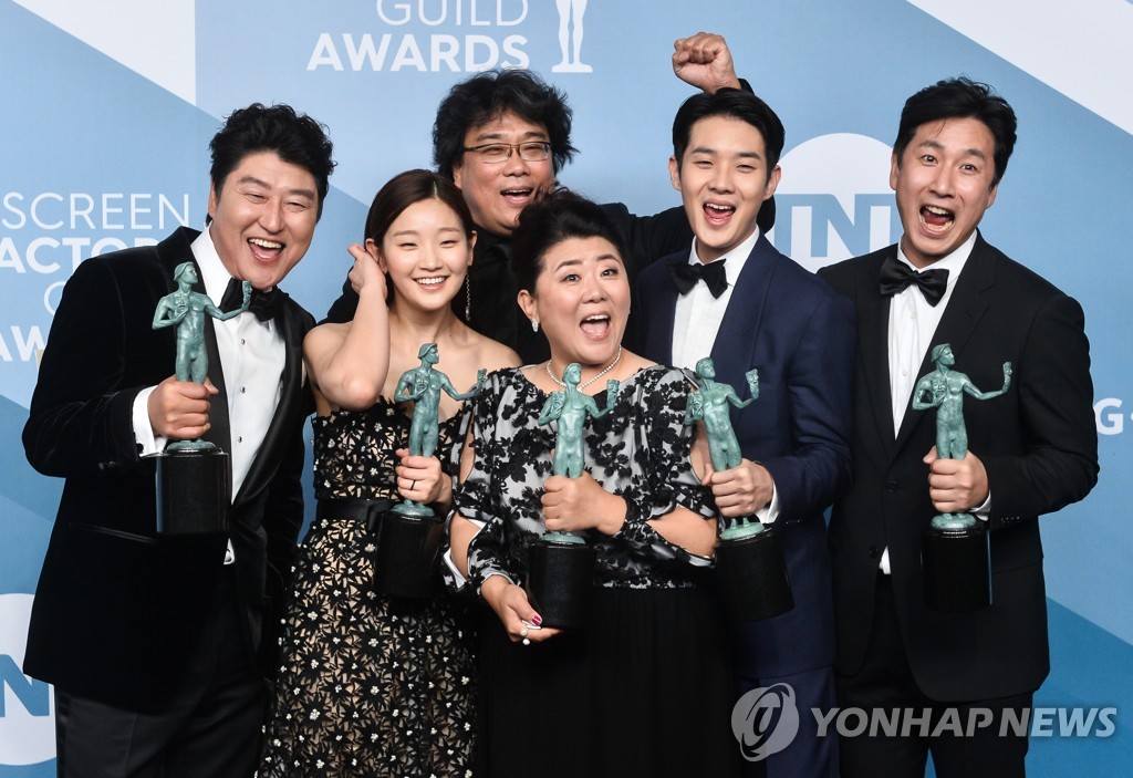 | ▲ In this UPI photo taken on Jan. 19, 2020, the cast of Bong Joon-ho's "Parasite" poses after winning the award for Outstanding Performance by a Cast in a Motion Picture at the 26th Screen Actors Guild Awards. (Yonhap) |