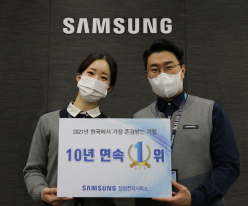 삼성전자서비스가 한국능률협회컨설팅이 26일 발표한 '2021년 한국에서 가장 존경받는 기업' 조사에서 서비스센터 부문 10년 연속 1위에 선정됐다.