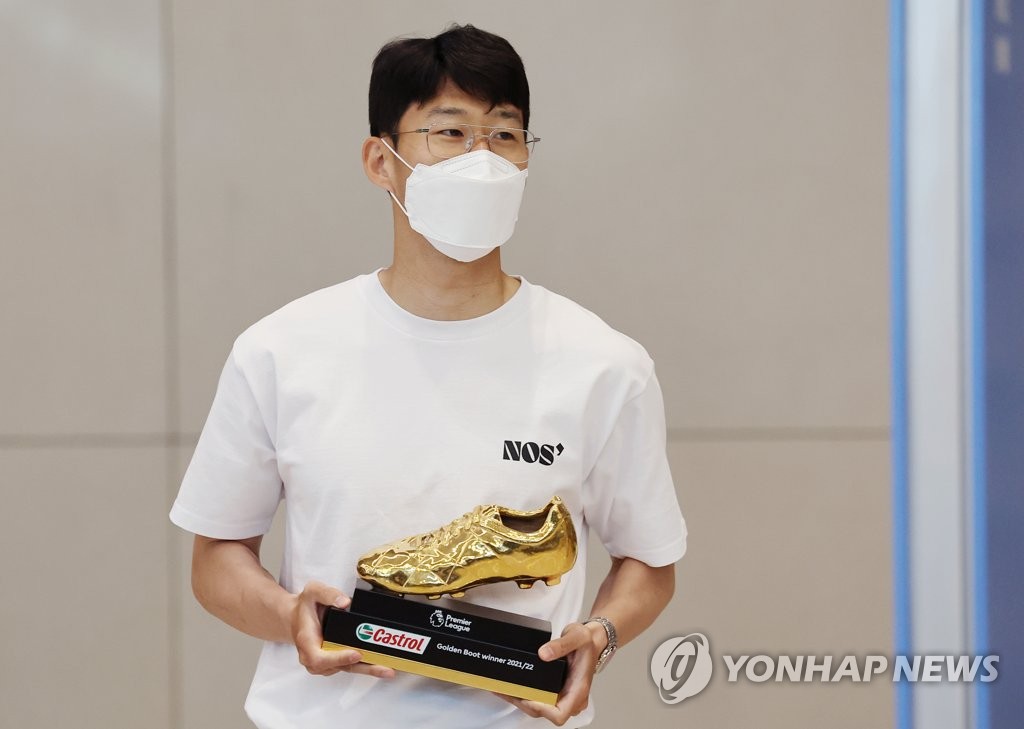 | ▲ EPL 득점왕, 손흥민의 골든 부트 (서울=연합뉴스) 홍해인 기자 = 2021~2022 시즌 잉글랜드 프리미어리그(EPL) 득점왕을 차지한 토트넘 홋스퍼의 손흥민이 24일 오후 인천국제공항 제2여객터미널을 통해 입국하며 골든 부트 트로피를 들어 보이고 있다. 2022.5.24 hihong@yna.co.kr |
