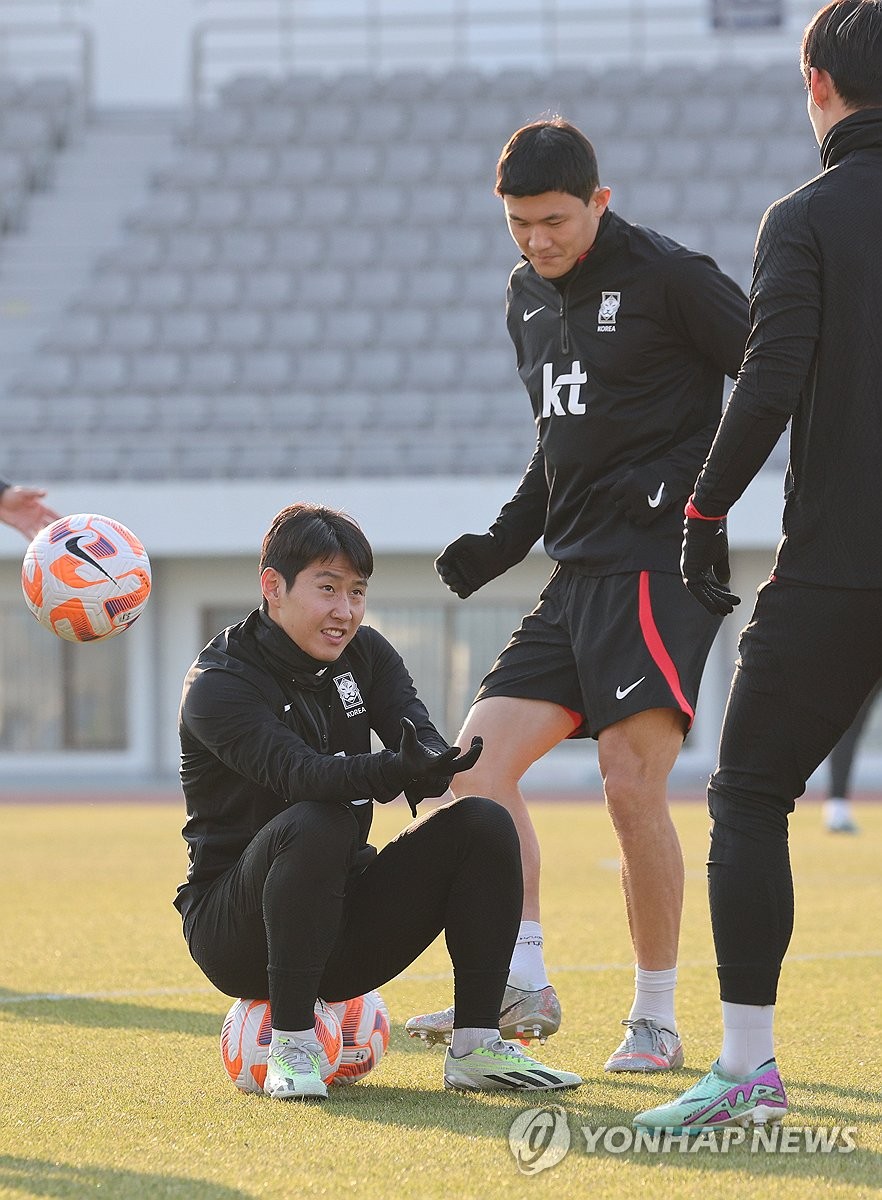 | ▲ 김민재 '강인아 나랑 놀자' (서울=연합뉴스) 임화영 기자 = 한국 축구대표팀 김민재가 14일 오후 서울 양천구 목동운동장에서 2026 국제축구연맹(FIFA) 복중미 월드컵 아시아 2차 예선 1차전 싱가포르와의 경기를 앞두고 나선 훈련 도중 이강인에게 장난을 치고 있다. 2023.11.14 hwayoung7@yna.co.kr |