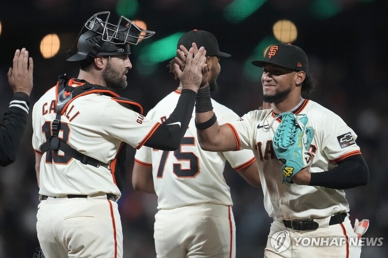 | ▲ 카살리, 2년 만에 샌프란시스코 복귀 (샌프란시스코 AP=연합뉴스) 포수 카살리(왼쪽)가 16일(한국시간) 미국 플로리다주 샌프란시스코의 오라클 파크에서 열린 2024 미국프로야구 메이저리그(MLB) 로스앤젤레스 다저스와의 홈 경기가 끝난 뒤, 동료들과 하이 파이브하고 있다. 카살리는 2년 만에 샌프란시스코로 돌아왔다. |