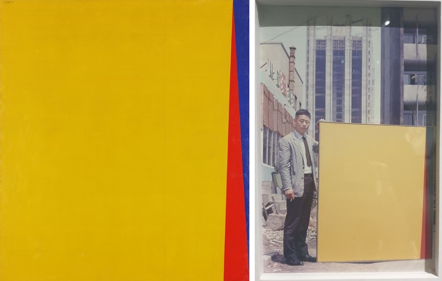 | ▲ 윤형근이 1969년 제10회 상파울루 비엔날레에 출품한 작품 '69-E8'(왼쪽.국립현대미술관 제공)과 당시 윤형근이 작품과 함께 찍은 사진. |