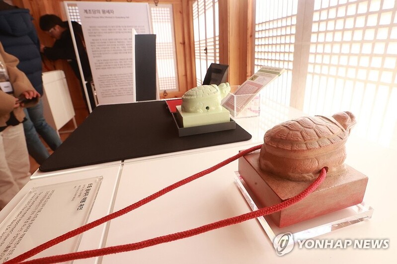 | ▲ 순종 왕세자 책봉 옥인 (서울=연합뉴스) 진연수 기자 = 14일 서울 종로구 경복궁 계조당에서 개막한 '왕세자의 공간, 경복궁 계조당' 전시에 순종 왕세자 책봉 옥인이 전시되어 있다. 2023.11.14 jin90@yna.co.kr |