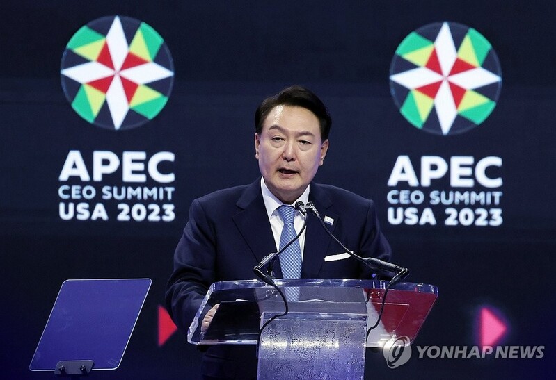 Yoon issued the call during a keynote speech delivered at the APEC CEO Summit in San Francisco, shortly after he arrived in the city for the APEC leaders' summit.