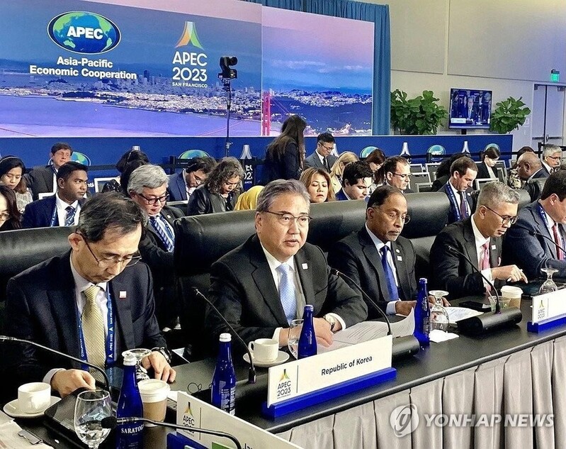 ▲ South Korean Foreign Minister Park Jin (front row, 2nd from L) attends a ministerial meeting at the Asia Pacific Economic Cooperation (APEC) forum in San Francisco on Nov. 14, 2023, in this photo provided by Seoul's foreign ministry the following day. (PHOTO NOT FOR SALE) (Yonhap)