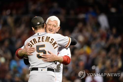 마이크는 3일(한국시간) 미국 매사추세츠주 보스턴 펜웨이 파크에서 열린 샌프란시스코-보스턴전을 앞두고 경기장을 방문한 할아버지 칼과 만났다.