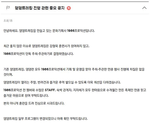 이외에도 강 대표는 이달 25∼26일 강원 정선군 하이원 리조트에서 열리는 반려견 행사 '댕댕트래킹 2024'에 당초 계획과 달리 불참하기로 했다. 이 행사의 공동 주최사였던 보듬컴퍼니 역시 손을 뗐다.