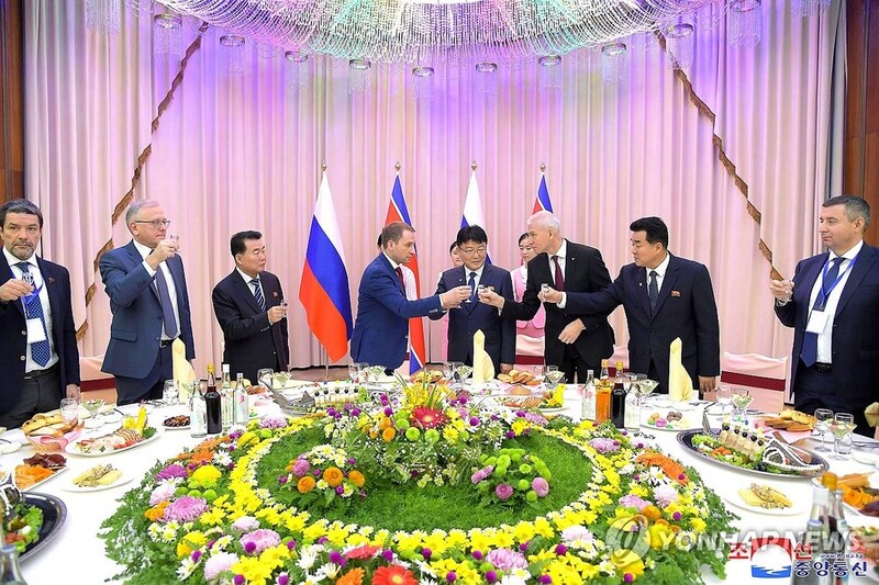▲ North Korean officials and a Russian delegation, led by its Natural Resources Minister Alexander Kozlov, toast in a reception held at the Koryo Hotel in Pyongyang on Nov. 14, 2023, in this photo carried by the Korean Central News Agency the following day. (For Use Only in the Republic of Korea. No Redistribution) (Yonhap)