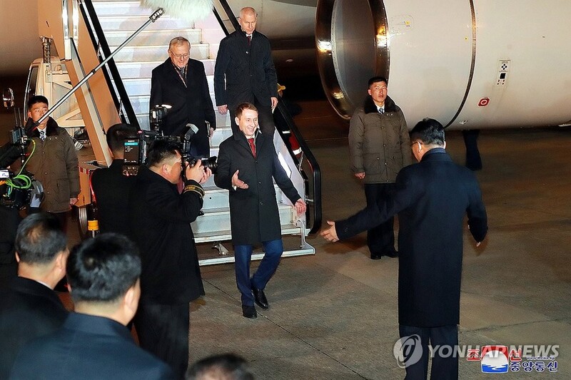 ▲ A Russian government delegation, led by Russian Natural Resources Minister Alexander Kozlov (C), arrives in Pyongyang on Nov. 14, 2023, to hold talks with North Korean officials to discuss trade and science cooperation, in this photo released the next day by North Korea's official Korean Central News Agency. (For Use Only in the Republic of Korea. No Redistribution) (Yonhap)