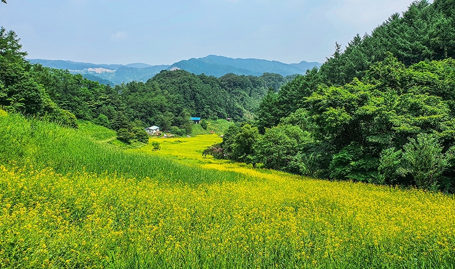 (청주=연합뉴스) 박재천 기자 = 매년 가을 하얀 메밀꽃으로 장관을 이루는 청주시 상당구 낭성면 추정리 된내기골 산허리가 노란 유채꽃밭으로 변신했다.