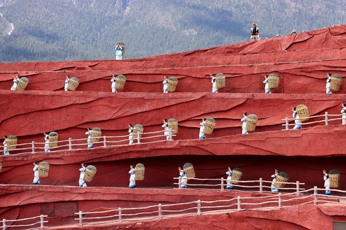 500여 명의 출연자가 소수 민족 고유 복장을 하고 무대를 채우니 옥룡설산과 멋진 조화를 만들어낸다.