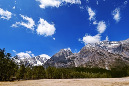 해발 3,200m의 운삼평에서 가문비나무에 둘러싸인 넓은 평원 너머로 옥룡설산 봉우리를 가까이 볼 수 있다.