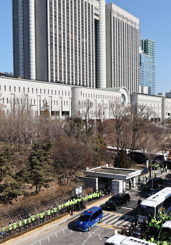 A Ministry of Justice vehicle (blue) carrying arrested President Yoon Suk Yeol drives out of the Seoul Central District Court in the capital on Feb. 20, 2025, after Yoon attended the first hearing of his criminal trial on insurrection charges in connection with his short-lived imposition of martial law in December. (Yonhap)