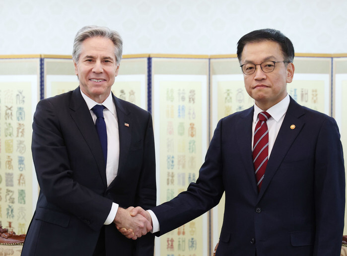 South Korean acting President Choi Sang-mok (R) and U.S. Secretary of State Antony Blinken shake hands during their meeting at the government complex in Seoul on Jan. 6, 2025. (Pool photo) (Yonhap)