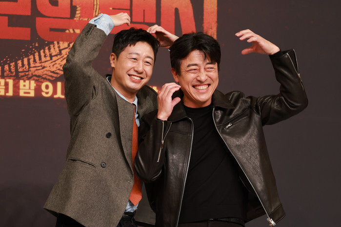 South Korean actors Bae Yoo-ram (L) and Jang Hyuk-jin, who star in the new drama "Taxi Driver 3," pose for a photo during a publicity event in Seoul on Nov. 18, 2025. The first episode of the drama will be aired by the SBS TV network on Nov. 21. (Yonhap)