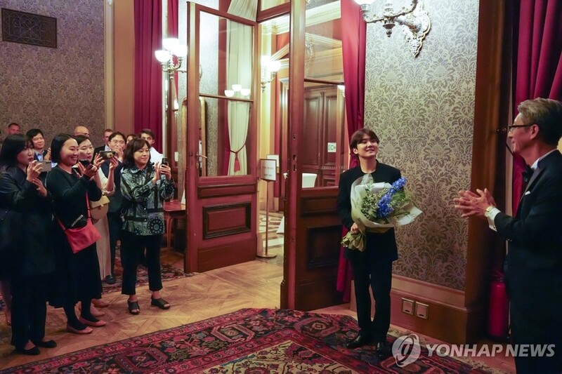| ▲ 콘서트 직후 열린 리셉션에서 조성진이 홍영기 주체코 대사로부터 감사 인사를 받고 있다. [사진/성연재 기자] |