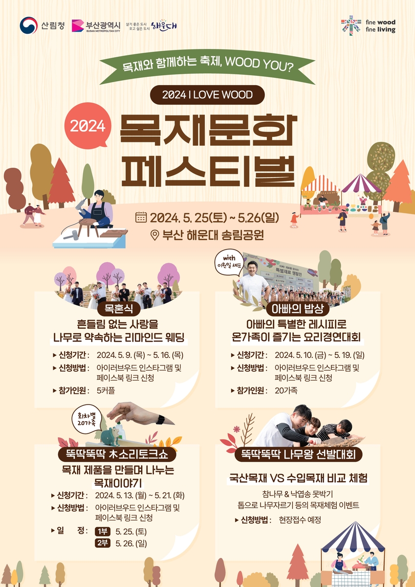 26일에는 부산 지역 특산물·임산물을 활용한 요리경연대회 '아빠의 밥상', 국산 목재로 탁자와 의자를 만들어 사회복지시설에 기부하는 '뚝딱뚝딱 목소리 토크쇼 2부'가 열린다.