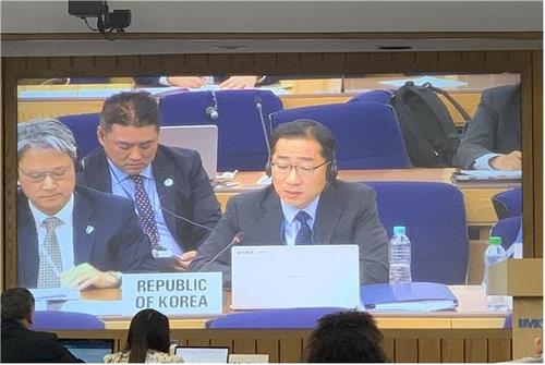 | ▲ Shin Jae-young (C), the head of the Marine Conservation Division of the Ministry of Oceans and Fisheries, addresses the 44th London Convention, in this photo provided by the ministry on Oct. 8, 2022. (PHOTO NOT FOR SALE) (Yonhap) |