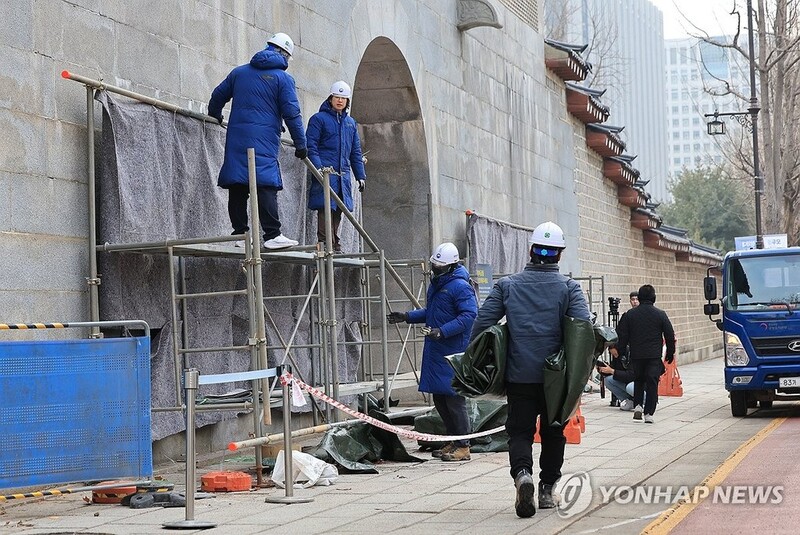 | ▲ 경복궁 영추문 가림막 철거 (서울=연합뉴스) 신현우 기자 = 4일 오전 서울 종로구 경복궁 영추문에서 문화재청 관계자들이 가림막을 철거하고 있다. 이날 문화재청은 낙서 제거 작업을 마친 경복궁 담장을 공개한다. 2024.1.4 nowwego@yna.co.kr |
