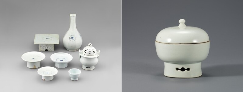 | ▲ 휴스턴박물관 한국실 주요 전시품 왼쪽은 수정(水晶) 박병래(1903∼1974) 선생이 기증한 백자 제기, 오른쪽은 동원(東垣) 이홍근(1900∼1980) 선생이 기증한 백자 향합 [국립중앙박물관 제공. 재판매 및 DB 금지] |
