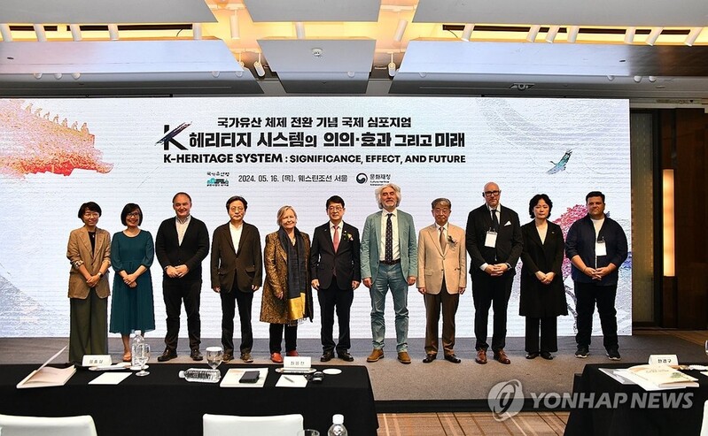 | ▲ 국가유산청 출범 기념 국제 심포지엄 (서울=연합뉴스) 최응천 문화재청장이 16일 서울 중구 웨스틴조선에서 국가유산청 출범을 맞아 국가유산 체계의 변화와 의의를 소개하기 위해 개최된 'K-헤리티지 시스템의 의의·효과 그리고 미래' 국제 심포지엄에서 관계자들과 기념 촬영하고 있다. 2024.5.16 [문화재청 제공. 재판매 및 DB 금지] photo@yna.co.kr |