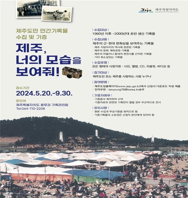 제주도는 '제주, 너의 모습을 보여줘'라는 주제로 근현대 변화상에 관한 시청각 형태의 자료(사진, 앨범, CD, 리플릿, 비디오 등)를 기증받는다고 16일 밝혔다.