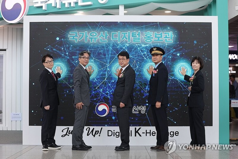 | ▲ 국가유산 디지털 홍보관 개관식 (서울=연합뉴스) 임화영 기자 = 최응천 문화재청장이 10일 서울역 공항철도역 입구에 마련된 국가유산 디지털 홍보관 개관식에서 참석자들과 기념촬영하고 있다.