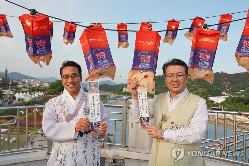 | ▲ 남원춘향제 (서울=연합뉴스) 오기웅 중소벤처기업부 차관(오른쪽)과 최경식 남원시장이 10일 전북 남원에서 열린 남원춘향제에서 소상공인 응원 메시지를 담은 점등식을 하며 기념촬영을 하고 있다. 2024.5.10 [중소벤처기업부 제공. 재판매 및 DB 금지] photo@yna.co.kr |