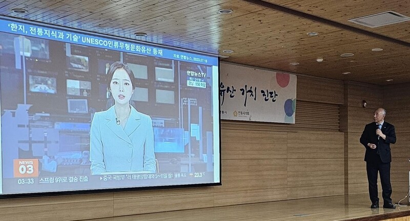 | ▲ 경상북도 한지 생산에 대해 발표하는 김형진 국민대 부총장 김형진 국민대부총장은 10일 안동문화예술의전당에서 열린 심포지엄에서 'FAO 세계중요농업유산과 유네스코 인류무형문화유산으로서의 경북 한지의 유래와 가치'를 주제로 발표했다. [한지살리기재단 제공] |