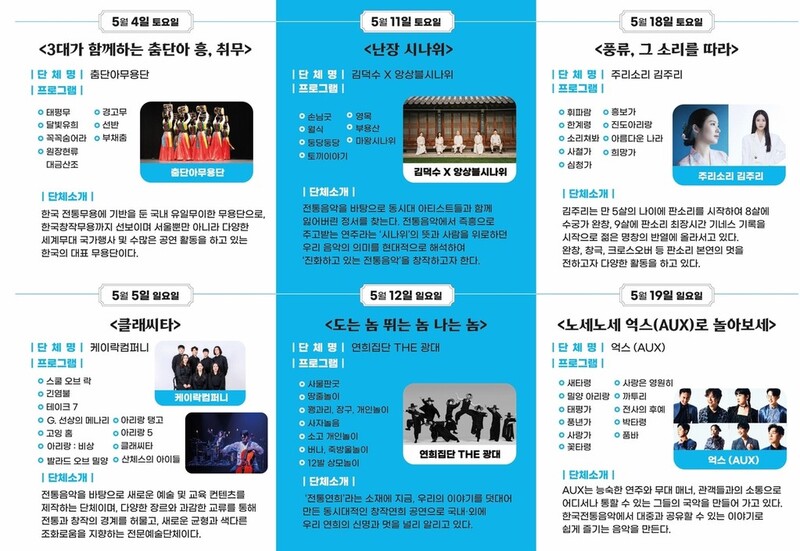 국악·판소리·한국무용 등 전통문화예술의 진수를 보여주는 무대부터, 퓨전 국악·창작 연희·장터 서커스 등 대중의 진입장벽을 낮추고 현대적으로 재해석한 공연도 마련됐다.