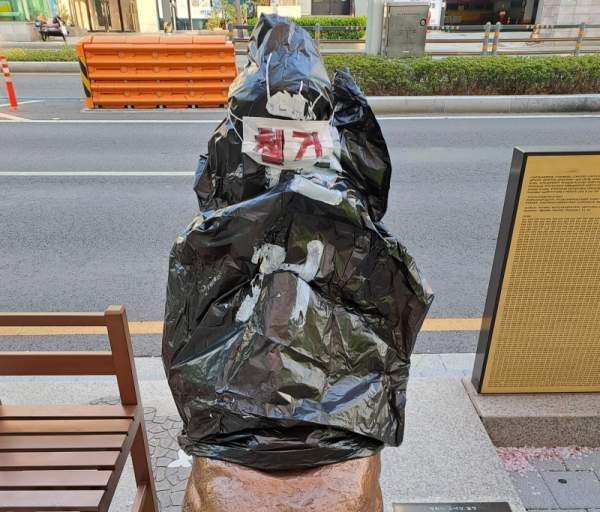 지난달 6일에는 A씨가 평화의 소녀상과 강제징용 노동자상에 '철거'라고 적힌 검정 봉지를 씌우기도 했다.