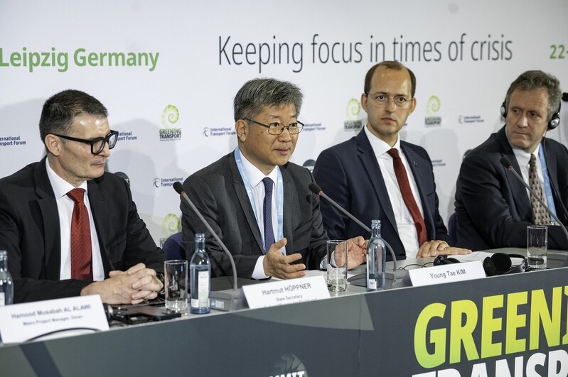 | ▲ This photo provided by the International Transport Forum (ITF) shows Secretary-General Young Tae Kim (2nd from L) speaking during a press conference at the 2024 ITF Summit in Leipzig, Germany, on May 23, 2024. (PHOTO NOT FOR SALE) (Yonhap) |