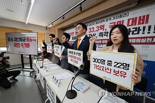 | ▲ Members of the Citizens' Coalition for Economic Justice hold a news conference on the wealth of lawmakers-elect in Seoul on May 21, 2024. (Yonhap) |