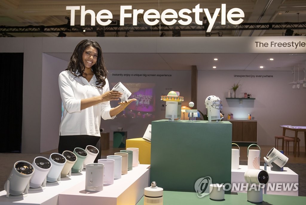 (라스베이거스=연합뉴스) 김영신 기자 = 삼성전자[005930]가 미국 라스베이거스에서 열리는 세계 최대 전자·IT 전시회 'CES 2022'에서 공간에 구애받지 않고 어디에나 화면을 띄우는 휴대용 프로젝터 '더 프리스타일'(The Freestyle)을 공개했다.