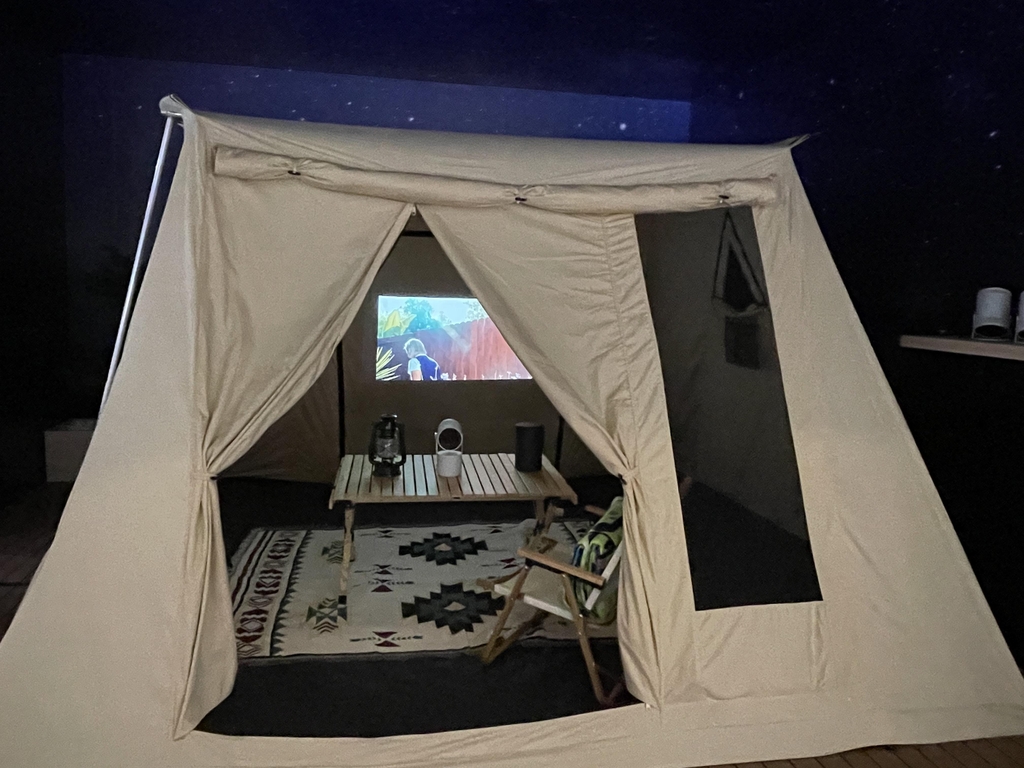 | ▲ 삼성전자 포터블 스크린 '더 프리스타일'로 캠핑 텐트에 화면을 만든 모습 [촬영=김영신 기자] |