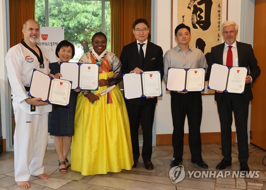 | ▲ CICI 20주년 기념 CCF 2023 문화소통포럼 열려 (서울=연합뉴스) 류효림 기자 = 필립 르포르 주한프랑스대사(왼쪽부터), 최정화 한국이미지커뮤니케이션연구원 대표, 마포 로르 소리꾼, 방효진 밀렌아시아 회장, 권준혁 마술사, 방효진 밀렌아시아 회장, 미하엘 라이펜슈툴 주한독일대사가 13일 서울 서대문구 주한프랑스 대사관저에서 열린 CICI 20주년 기념 CCF 2023 문화소통포럼에서 기념촬영을 하고 있다. 2023.6.13 ryousanta@yna.co.kr |