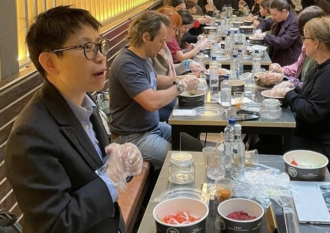 (옥스퍼드=연합뉴스) 김지연 특파원 = 다양한 연령대의 영국인 20여 명이 진지한 얼굴로 토마토와 부추, 양파가 담긴 그릇에 빨간 김치 양념을 버무리고 보관용기에 옮겨 담으며 뿌듯한 표정을 짓는다.