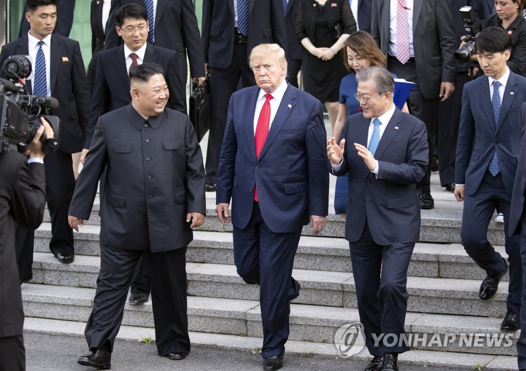 | ▲ This June 30, 2019, file photo shows then South Korean President Moon Jae-in (R) and his U.S. and North Korean counterparts, Donald Trump (C) and Kim Jong-un, at the inter-Korean truce village of Panmunjom. (Yonhap) |