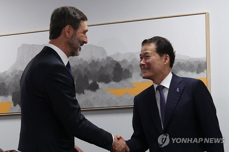 | ▲ Unification Minister Kim Yung-ho (R) shakes hands with Slovak Foreign Minister Juraj Blanar during their meeting in Seoul on May 13, 2024. (Yonhap) |