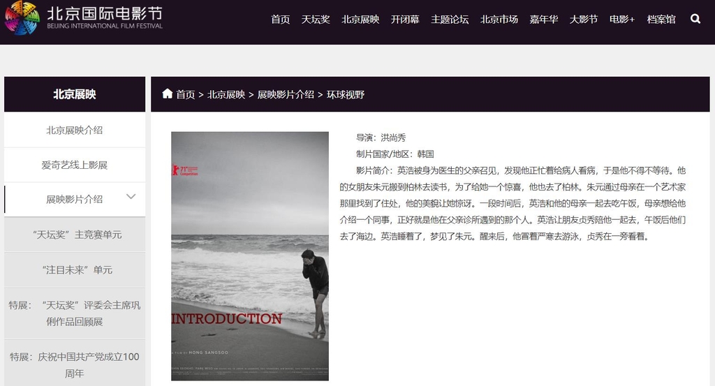 | ▲ 베이징영화제 홈페이지의 홍상수 작품 '인트로덕션' 소개 내용 [베이징영화제 홈피 캡처=연합뉴스] |